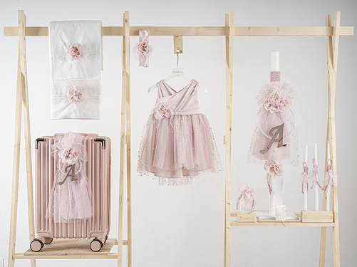 Βαπτιστικό πακέτο Piccolino Zoe pink περιλαμβάνει φόρεμα ,σετ λαδόπανα, λαμπάδα, λαδοσετ και στολισμένη βαλίτσα pink