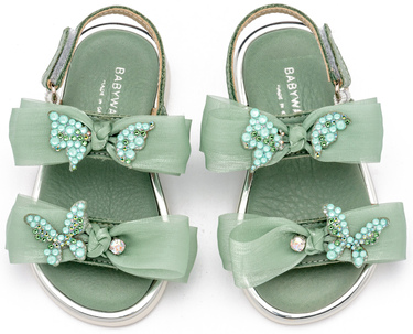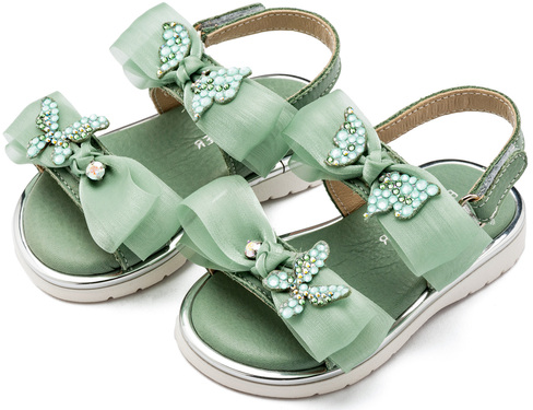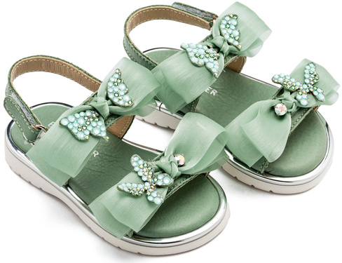 LU6119-SALVIA1 Δερμάτινο Πέδιλο με Φιόγκους Οργάντζας και Πεταλούδες Swarovski σε Μέντα Χρώμα