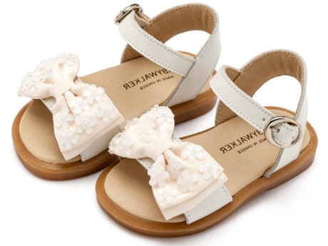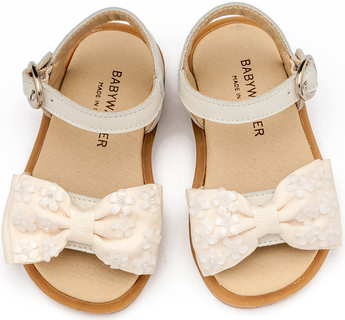 BW4854-IVORY1 Δερμάτινο Πέδιλο με Gros Grain Φιογκάκι και Λουλουδάκια σε Εκρού Χρώμα