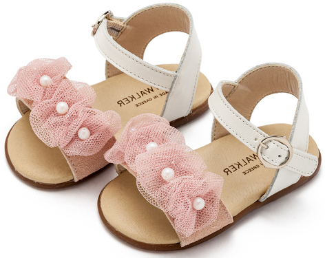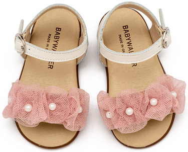 PRI2645-IVORY-PINK1 Δερμάτινο Πέδιλο Διακοσμημένο με Τούλινα Λουλουδάκια και Πέρλες από Δέρμα Πέρλα σε Εκρού Ροζ Χρώμα