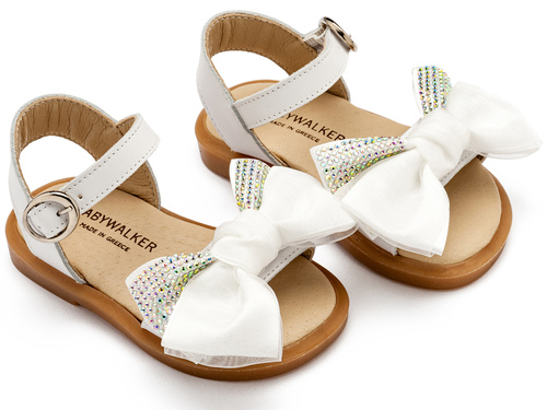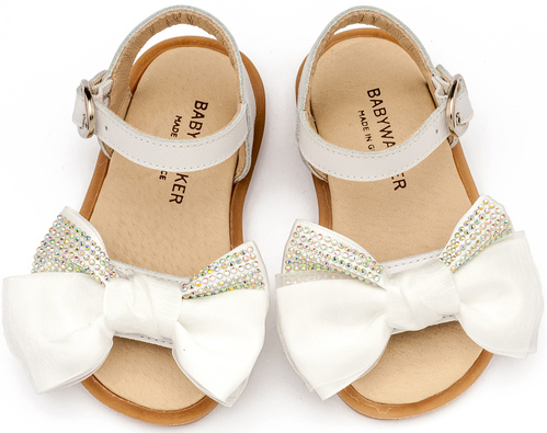 BW4861-WHITE1 Δερμάτινο Πέδιλο με Σατέν Φιογκάκι & Στρας σε Λευκό Χρώμα