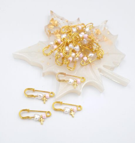 Μαρτυρικό πέτου με ροζ χάντρα και λευκή πέρλα σε σχήμα καρδιά, σταυρός. Οι φωτογραφίες έχουν υποστεί επεξεργασία και τα χρώματα ίσως να διαφέρουν λίγο στην πραγματικότητα. Η τιμή αφορά συσκευασία 50 τεμαχίων.