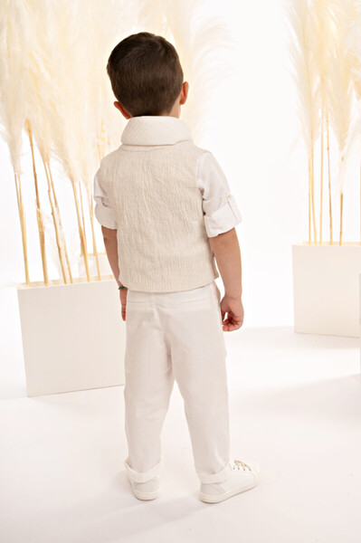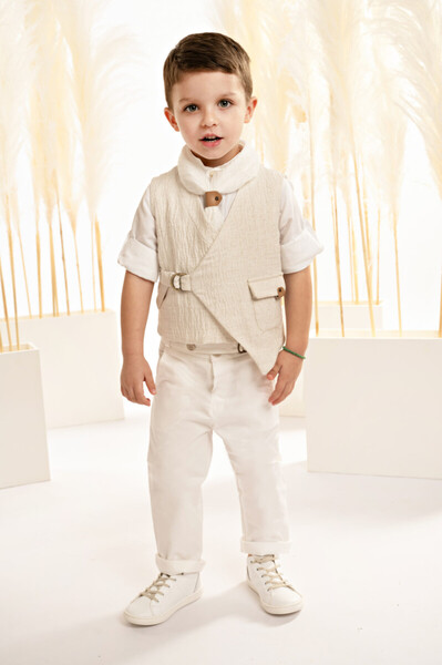 125016 Ένα σύνολο που αποπνέει φινέτσα και σύγχρονη minimal αισθητική. Παντελόνι από λευκή βαμβακερή καμπαρντίνα που ξεχωρίζει για τη μοναδική λεπτομέρεια στο ζωνάκι και γιλέκο, με λοξό ασύμμετρο κόψιμο και εξωτερικό τσεπάκι, από μπεζ γκοφρέ μελανζέ cotton-lino ύφασμα. Το βαμβακερό πουκάμισο mao με τον ιδιαίτερο γιακά σε off white απόχρωση συμπληρώνει το σύνολο ενώ το υπέροχο πλισέ φουλάρι στην ίδια απόχρωση χαρίζει αίσθηση αβίαστης κομψότητας. Το outfit ολοκληρώνεται με ψάθινο καπέλο ή τραγιάσκα (ανάλογα με την προτίμηση), προσθέτοντας την τελική πινελιά σε αυτό το σύγχρονο και κομψό σύνολο.