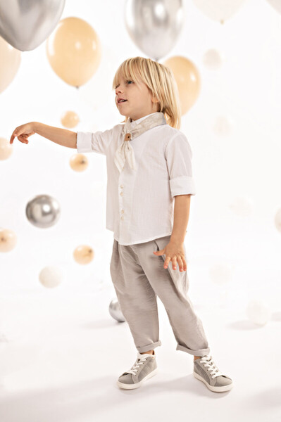 125029 Αυτό το σύνολο αντιπροσωπεύει τα σημερινά trend με τον καλύτερο τρόπο . Η απλότητα του παντελονιού με τις reverse πιέτες σε γκρι modal ύφασμα συνδυάζεται τέλεια με το βαμβακερό πουκάμισο σε off white χρώμα και το χαρακτηριστικό mao γιακά με το λοξό κλείσιμο. Το personalized βουάλ φουλάρι με τα γεωμετρικά λαχούρια σε μπεζ-γκρι αποχρώσεις προσθέτει μια προσεγμένη αισθητική , ενώ η ζώνη από υφαντό ιμάντα και το ψάθινο καπέλο ή τραγιάσκα (ανάλογα με την προτίμηση) ολοκληρώνουν άψογα το σετ.