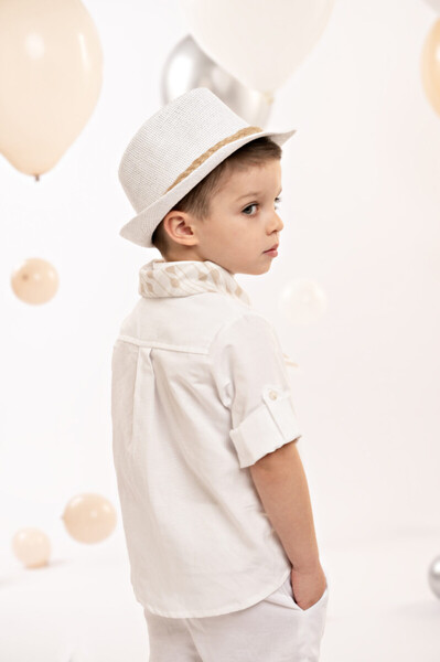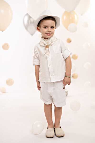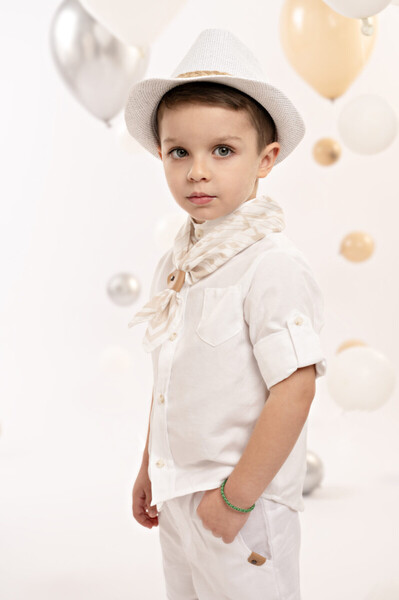 125031 Ένα μοντέρνο σύνολο με καλοκαιρινή αύρα και υπέροχο design που αποτελείται από βερμούδα σε loose γραμμή από tencel-cotton-lino ύφασμα και βαμβακερό πουκάμισο σε off white απόχρωση με πολύ ιδιαίτερο Mao γιακά και εξωτερικό τσεπάκι. Το σετ συμπληρώνει άψογα το personalized βουάλ φουλάρι με τα γεωμετρικά σχέδια σε μπεζ απόχρωση και το ψάθινο καπέλο (ή τραγιάσκα κατά επιλογή).