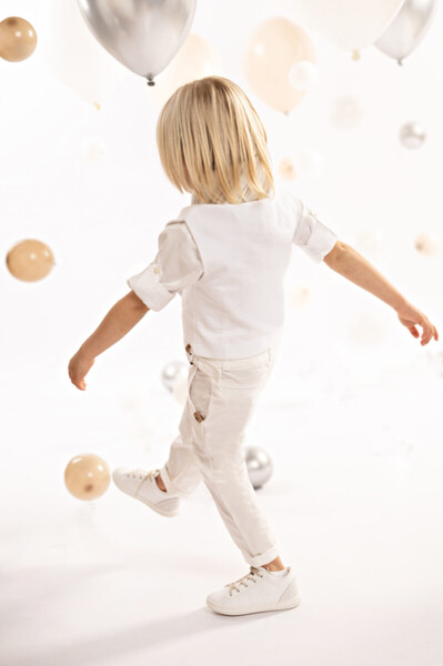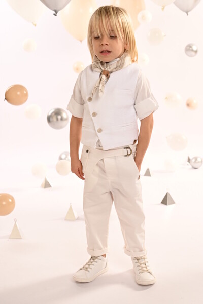 125032 Ένα σετ με μοναδική αίσθηση στυλ και φινέτσας, με το ιδιαίτερο λευκό παντελόνι σε ίσια γραμμή, που συνοδεύεται από έξτρα αξεσουάρ ζώνη με εξωτερική cargo τσέπη από βαμβακερή καμπαρντίνα. Το γιλέκο με λοξό κούμπωμα και διπλά φιλέτα τσέπες, φτιαγμένο από λευκό βαμβακερό γκοφρέ ύφασμα, ενισχύει την ιδιαιτερότητα του συνόλου. Το βαμβακερό πουκάμισο σε off white απόχρωση με ιδιαίτερο Μao γιακά ,συνδυάζεται άψογα με το υφαντό ριγέ φουλάρι σε off white-μπεζ χρώμα και το ψάθινο καπέλο (ή τραγιάσκα κατά επιλογή) δίνοντας μια άκρως καλοκαιρινή αίσθηση.