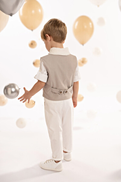 125037 Ένα σύνολο που παντρεύει την παραδοσιακή κομψότητα με μοντέρνα γραμμές, ιδανικό για κομψές εμφανίσεις. Αποτελείται από παντελόνι δίπιετο με έξτρα λοξή ζώνη από λευκή βαμβακερή καμπαρντίνα κ γιλέκο με κλασσικό κόψιμο σε μελανζέ καμβά ύφασμα. Το βαμβακερό πουκάμισο σε off white απόχρωση με το πολύ ιδιαίτερο Mao γιακά συνδυάζεται ιδανικά με το φουλάρι σε off white απόχρωση από βαμβακερή υφαντή γάζα και το ψάθινο καπέλο (ή τραγιάσκα κατά επιλογή).