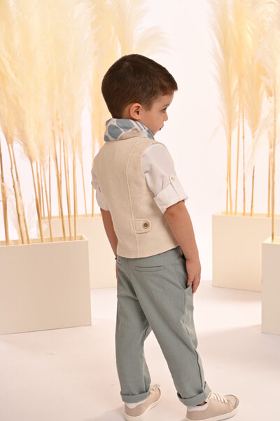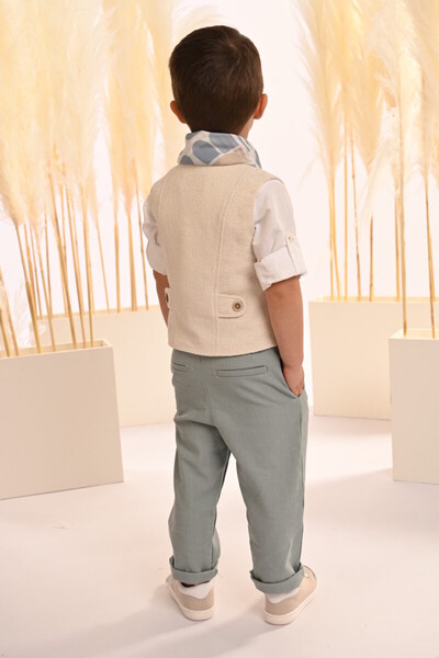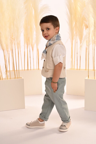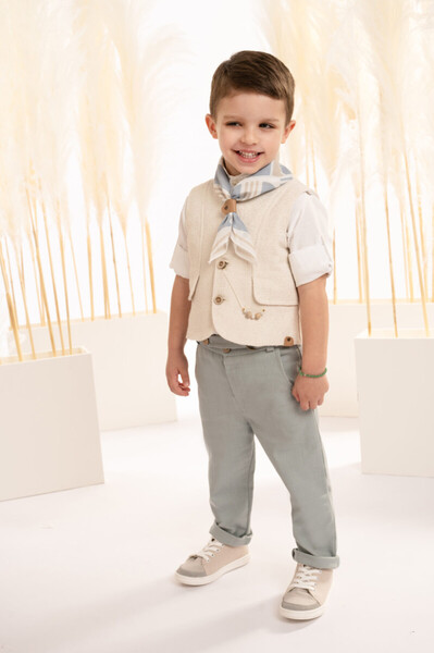125040 Ένα σύνολο γεμάτο φρεσκάδα με υπέροχο συνδυασμό χρωμάτων και υφών το οποίο αποτελείται από, παντελόνι με ιδιαίτερη λεπτομέρεια στο ζωνάκι από λινό σε mint χρώμα και γιλέκο σε κλασσική γραμμή με έξυπνα κοψίματα, φτιαγμένο από υπέροχο υφαντό ιταλικό ύφασμα σε εκρού απόχρωση. Το βαμβακερό πουκάμισο σε off white απόχρωση έχει έναν πολύ ιδιαίτερο Μao γιακά, ενώ το σύνολο ολοκληρώνεται άψογα με το personalized βουάλ φουλάρι με γεωμετρικά σχέδια σε μπεζ-σιέλ απόχρωση και το ψάθινο καπέλο (ή τραγιάσκα κατά επιλογή).