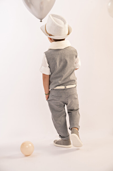 125005 Αυτό το σύνολο αποπνέει μοναδικό στυλ. Από βαμβακερό ύφασμα σε γκρι-μπλε απόχρωση, το παντελόνι ξεχωρίζει με τη διπλή του ζώνη και τις λοξές τσέπες, ενώ το γιλέκο με το ασύμμετρο κόψιμο και το εξωτερικό τσεπάκι προσθέτει μια δόση σύγχρονης φινέτσας. Το βαμβακερό πουκάμισο σε off white χρώμα, με τον ιδιαίτερο Mao γιακά, ολοκληρώνει την κομψή σύνθεση. Η τελική πινελιά δίνεται από το αέρινο βαμβακερό φουλάρι σε γάζα, τη λευκή κορδόνι-ζώνη και το ψάθινο καπέλο (ή τραγιάσκα κατά επιλογή), δημιουργώντας ένα απόλυτα ισορροπημένο και στιλάτο look.