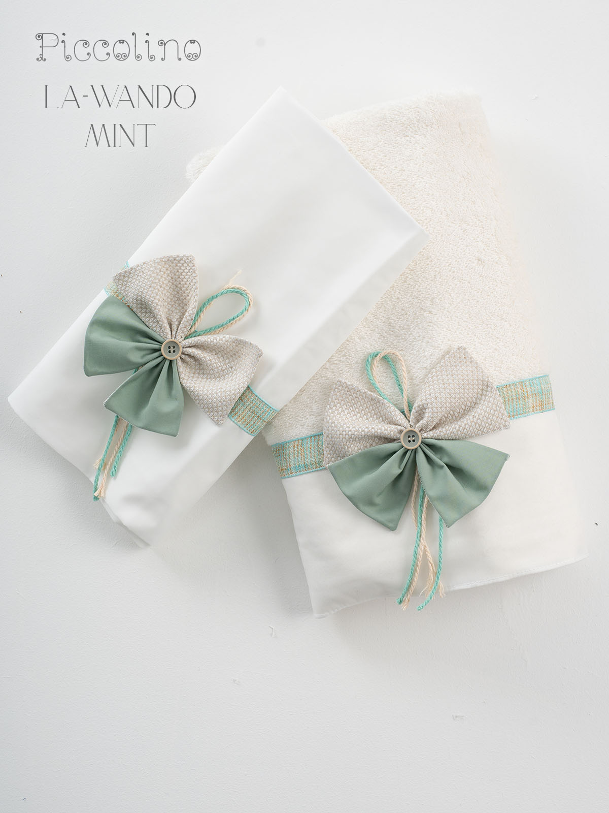 Σετ λαδόπανα Piccolino. Αποτελείται απο βαμβακερό λαδόπανο, πετσέτα 140*70εκ, εσώρουχα και πετσέτα ιερέα 30*50εκ. Στολισμένα με χειροποίητα υφασμάτινα λουλούδια.