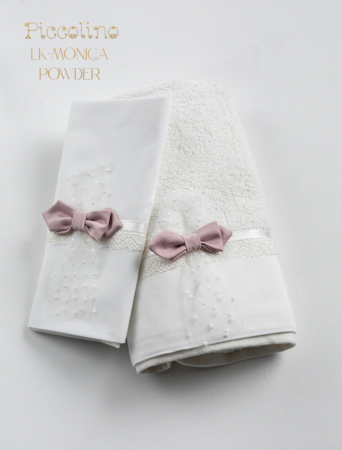 Σετ λαδόπανα Piccolino LK-MONICA POWDER. Αποτελείται απο βαμβακερό λαδόπανο, πετσέτα 140*70εκ, εσώρουχα και πετσέτα ιερέα 30*50εκ. Στολισμένα με χειροποίητα υφασμάτινα λουλούδια. Συνοδευτικό του φορέματος Piccolino MONICA POWDER