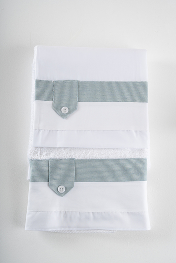 Σετ λαδόπανα Piccolino LK-JOLANDA POWDER. Αποτελείται απο βαμβακερό λαδόπανο, πετσέτα 140*70εκ, εσώρουχα και πετσέτα ιερέα 30*50εκ. Στολισμένα με χειροποίητα υφασμάτινα λουλούδια. Συνοδευτικό του φορέματος Piccolino JOLANDA POWDER
