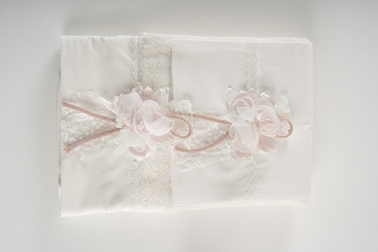 Σετ λαδόπανα Piccolino. Αποτελείται απο βαμβακερό λαδόπανο, πετσέτα 140*70εκ, εσώρουχα και πετσέτα ιερέα 30*50εκ. Στολισμένα με χειροποίητα υφασμάτινα λουλούδια. LK-MICHELE.IVORY