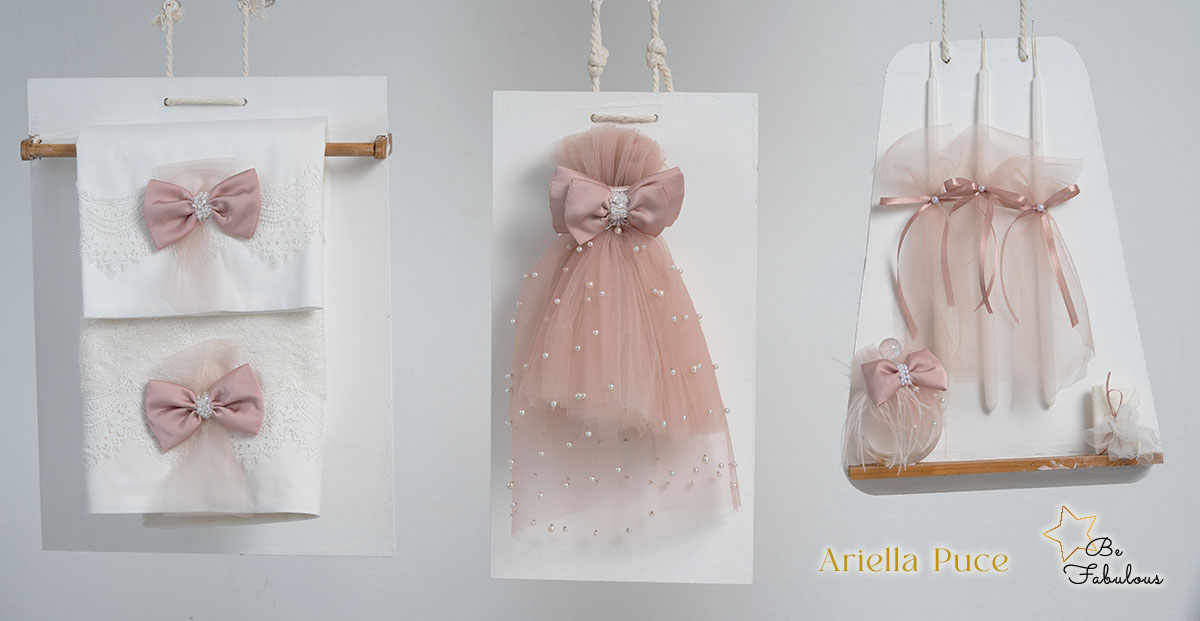 Σετ βάπτισης Be Fabulous Ariella Puce. Περιλαμβάνει λαδόπανο (πετσέτα 450gsm και σεντόνι 70*140εκ, εσώρουχα και πετσέτα ιερέα), λαμπάδα στολισμένη, στολισμό συσκευασίας (μπραντς), λαδοσέτ (στολισμένα 3κεράκια, μπουκαλάκι,σαπούνι) .Το ρούχο δεν περιλαμβάνεται στην τιμη του σετ βάπτισης.