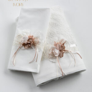 Σετ λαδόπανα Piccolino LK-ELENA IVORY. Αποτελείται απο βαμβακερό λαδόπανο, πετσέτα 140*70εκ, εσώρουχα και πετσέτα ιερέα 30*50εκ. Στολισμένα με χειροποίητα υφασμάτινα λουλούδια. Συνοδευτικό του φορέματος Piccolino GIANNA Ivory