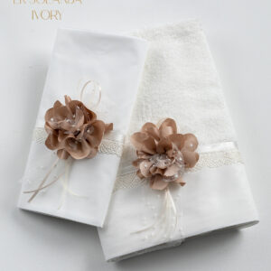 Σετ λαδόπανα Piccolino LK-NOVA IVORY. Αποτελείται απο βαμβακερό λαδόπανο, πετσέτα 140*70εκ, εσώρουχα και πετσέτα ιερέα 30*50εκ. Στολισμένα με χειροποίητα υφασμάτινα λουλούδια. Συνοδευτικό του φορέματος Piccolino NOVA IVORY