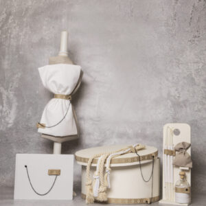 Σετ βάπτισης Piccolino APHRODITE IVORY. Περιλαμβάνει λαδόπανο (πετσέτα 450gsm και σεντόνι 70*140εκ, εσώρουχα και πετσέτα ιερέα), λαμπάδα στολισμένη, στολισμό συσκευασίας (μπραντς), λαδοσέτ (στολισμένα 3κεράκια, μπουκαλάκι,σαπούνι) .Το ρούχο δεν περιλαμβάνεται στην τιμη του σετ βάπτισης.