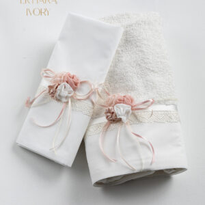 Σετ λαδόπανα Piccolino LK-NOVA IVORY. Αποτελείται απο βαμβακερό λαδόπανο, πετσέτα 140*70εκ, εσώρουχα και πετσέτα ιερέα 30*50εκ. Στολισμένα με χειροποίητα υφασμάτινα λουλούδια. Συνοδευτικό του φορέματος Piccolino NOVA IVORY