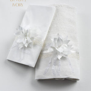 Σετ λαδόπανα Piccolino LK-NOVA IVORY. Αποτελείται απο βαμβακερό λαδόπανο, πετσέτα 140*70εκ, εσώρουχα και πετσέτα ιερέα 30*50εκ. Στολισμένα με χειροποίητα υφασμάτινα λουλούδια. Συνοδευτικό του φορέματος Piccolino NOVA IVORY