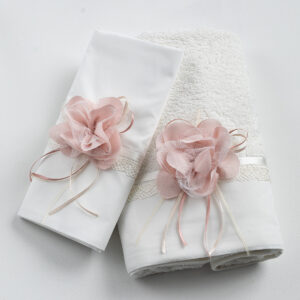 Σετ λαδόπανα Piccolino LK-JOLANDA POWDER. Αποτελείται απο βαμβακερό λαδόπανο, πετσέτα 140*70εκ, εσώρουχα και πετσέτα ιερέα 30*50εκ. Στολισμένα με χειροποίητα υφασμάτινα λουλούδια. Συνοδευτικό του φορέματος Piccolino JOLANDA POWDER