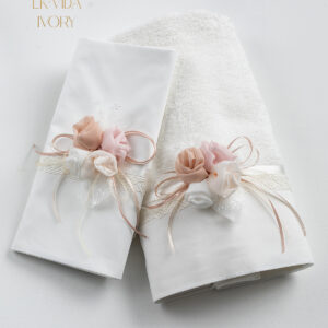 Σετ λαδόπανα Piccolino LK-MYRIAM IVORY. Αποτελείται απο βαμβακερό λαδόπανο, πετσέτα 140*70εκ, εσώρουχα και πετσέτα ιερέα 30*50εκ. Στολισμένα με χειροποίητα υφασμάτινα λουλούδια. Συνοδευτικό του φορέματος Piccolino MYRIAM IVORY