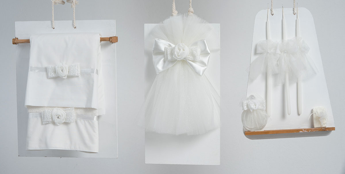 Σετ λαδόπανα Piccolino LK-TIFFANY IVORY. Αποτελείται απο βαμβακερό λαδόπανο, πετσέτα 140*70εκ, εσώρουχα και πετσέτα ιερέα 30*50εκ. Στολισμένα με χειροποίητα υφασμάτινα λουλούδια. Συνοδευτικό του φορέματος Piccolino TIFFANY IVORY