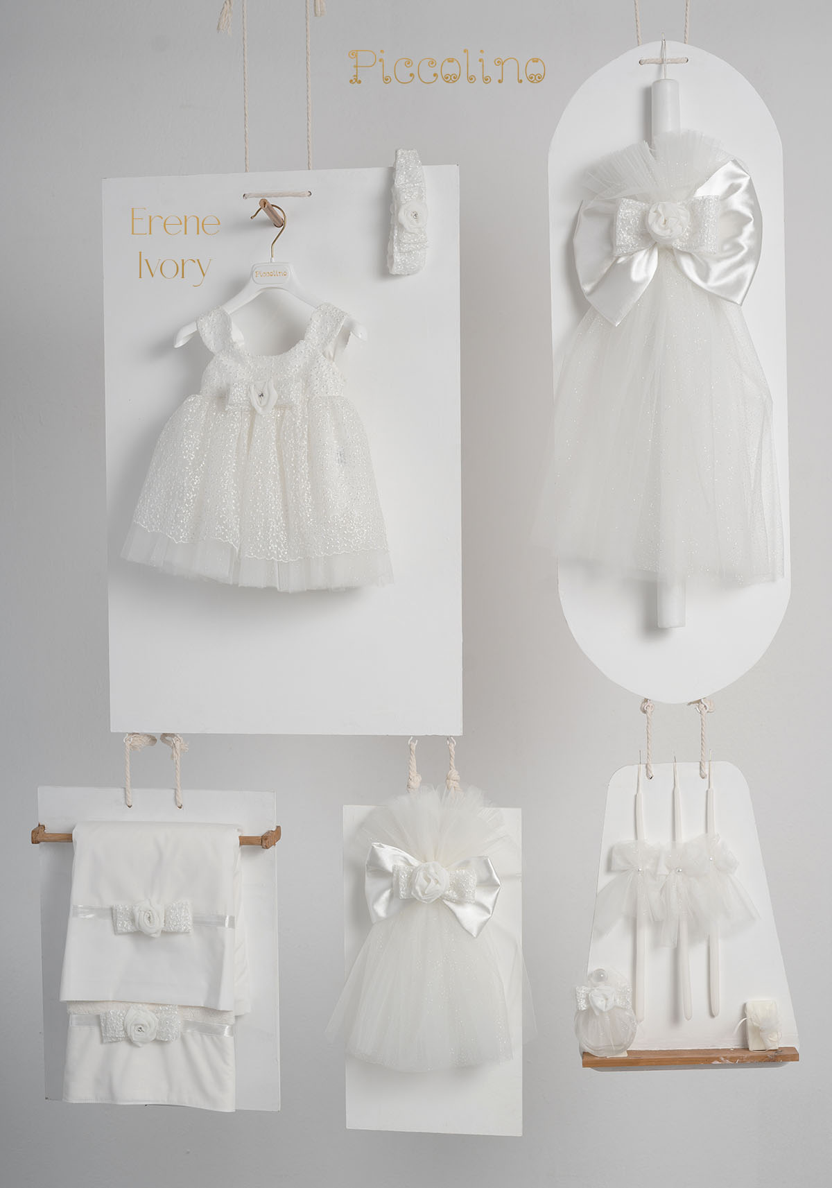 Σετ βάπτισης Piccolino ERENE IVORY. Περιλαμβάνει λαδόπανο (πετσέτα 450gsm και σεντόνι 70*140εκ, εσώρουχα και πετσέτα ιερέα), λαμπάδα στολισμένη, στολισμό συσκευασίας (μπραντς), λαδοσέτ (στολισμένα 3κεράκια, μπουκαλάκι,σαπούνι) .Το ρούχο δεν περιλαμβάνεται στην τιμη του σετ βάπτισης.