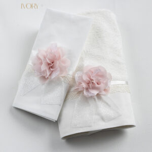 Σετ λαδόπανα Piccolino LK-NOVA IVORY. Αποτελείται απο βαμβακερό λαδόπανο, πετσέτα 140*70εκ, εσώρουχα και πετσέτα ιερέα 30*50εκ. Στολισμένα με χειροποίητα υφασμάτινα λουλούδια. Συνοδευτικό του φορέματος Piccolino NOVA IVORY