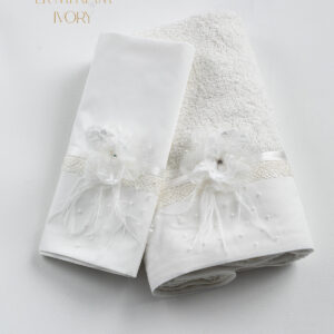 Σετ λαδόπανα Piccolino LK-ELENA IVORY. Αποτελείται απο βαμβακερό λαδόπανο, πετσέτα 140*70εκ, εσώρουχα και πετσέτα ιερέα 30*50εκ. Στολισμένα με χειροποίητα υφασμάτινα λουλούδια. Συνοδευτικό του φορέματος Piccolino GIANNA Ivory