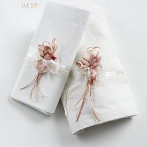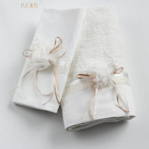 Σετ λαδόπανα Piccolino LK-NOVA IVORY. Αποτελείται απο βαμβακερό λαδόπανο, πετσέτα 140*70εκ, εσώρουχα και πετσέτα ιερέα 30*50εκ. Στολισμένα με χειροποίητα υφασμάτινα λουλούδια. Συνοδευτικό του φορέματος Piccolino NOVA IVORY