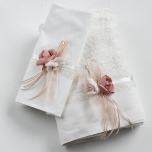 Σετ λαδόπανα Piccolino LK-YASMINE PINK. Αποτελείται απο βαμβακερό λαδόπανο, πετσέτα 140*70εκ, εσώρουχα και πετσέτα ιερέα 30*50εκ. Στολισμένα με χειροποίητα υφασμάτινα λουλούδια. Συνοδευτικό του φορέματος Piccolino YASMINE PINK