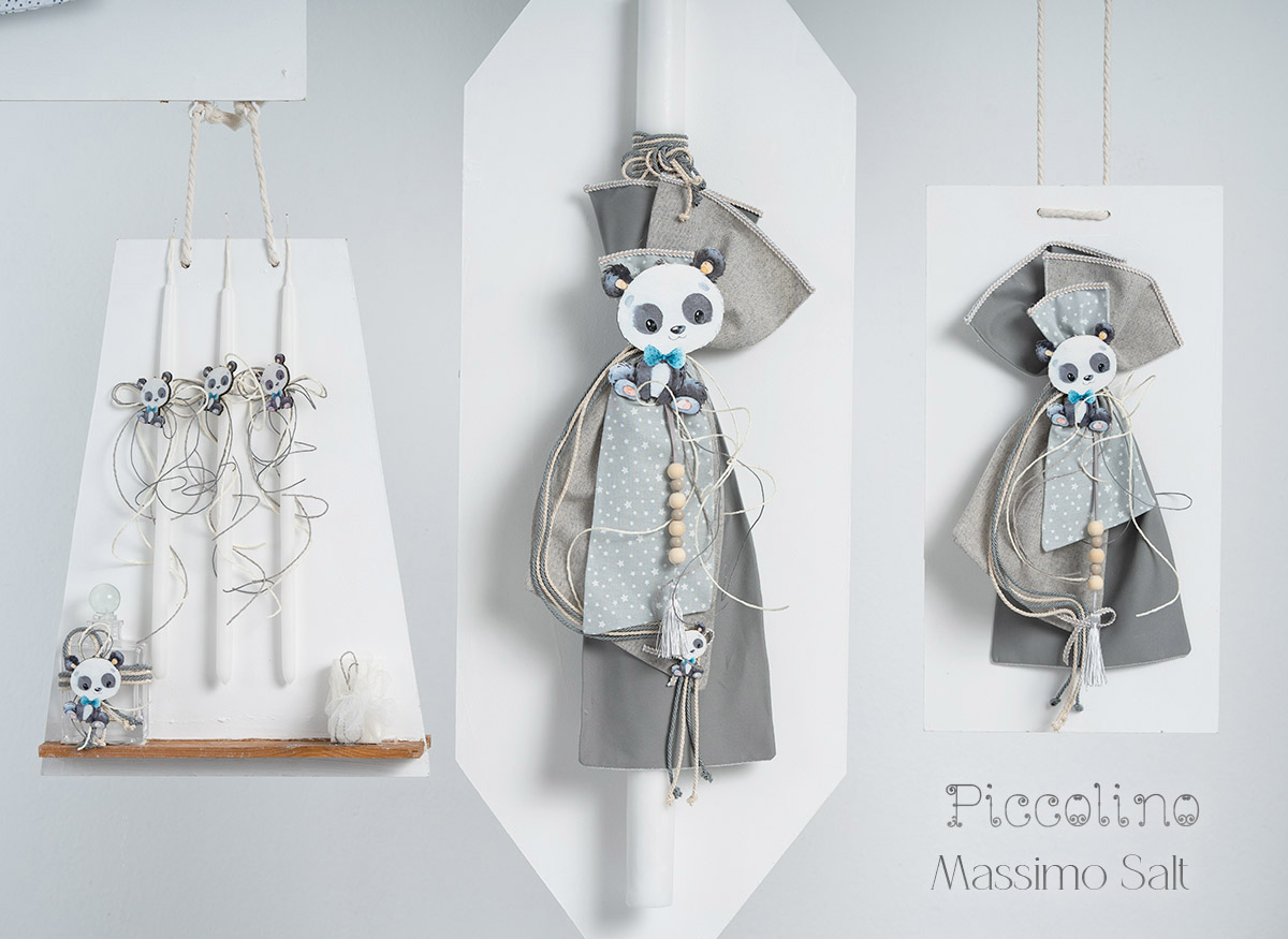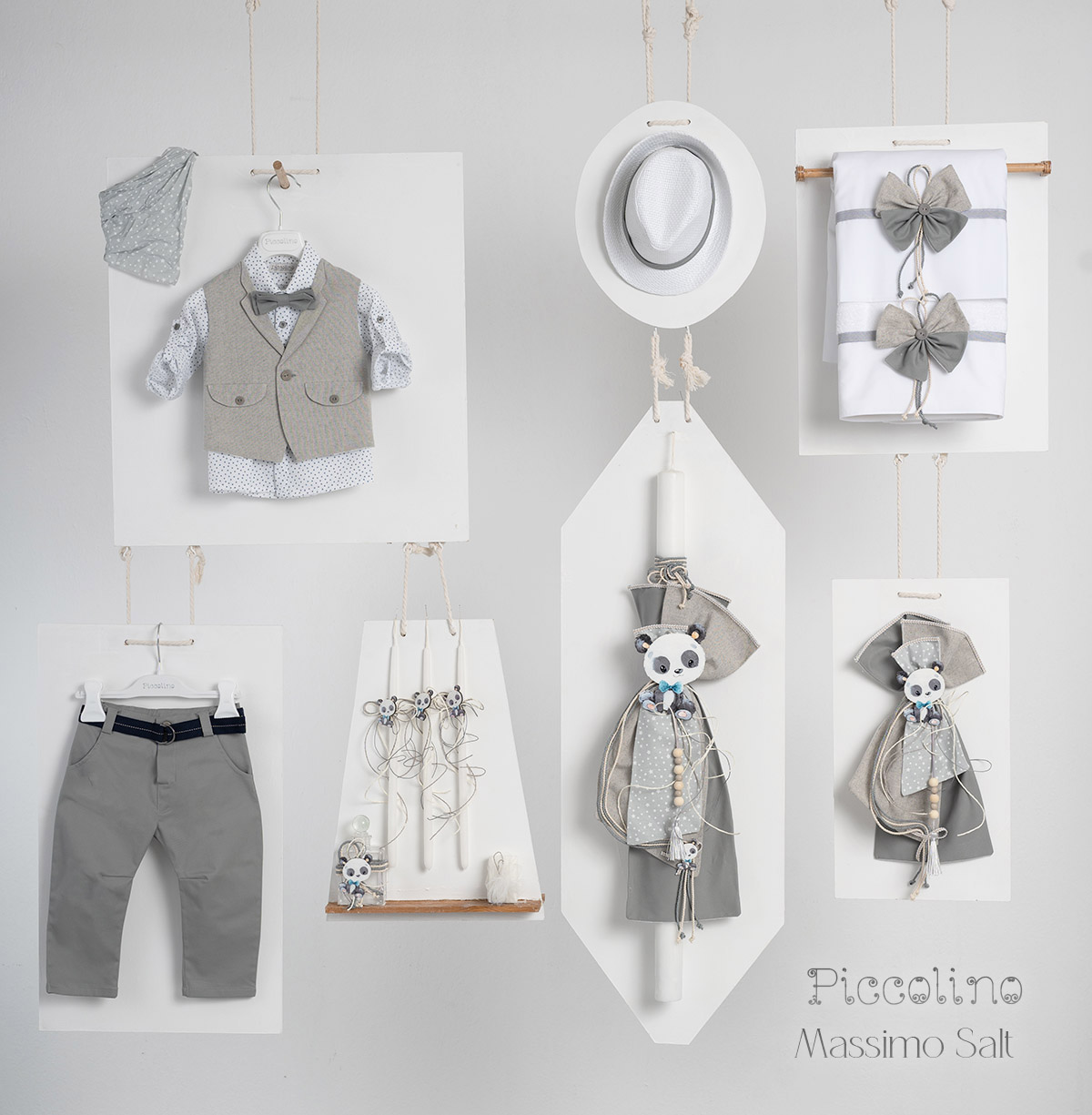 Σετ βάπτισης Piccolino MASSIMO SALT. Περιλαμβάνει λαδόπανο (πετσέτα 450gsm και σεντόνι 70*140εκ, εσώρουχα και πετσέτα ιερέα), λαμπάδα στολισμένη, στολισμό συσκευασίας (μπραντς), λαδοσέτ (στολισμένα 3κεράκια, μπουκαλάκι,σαπούνι) .Το ρούχο δεν περιλαμβάνεται στην τιμη του σετ βάπτισης.