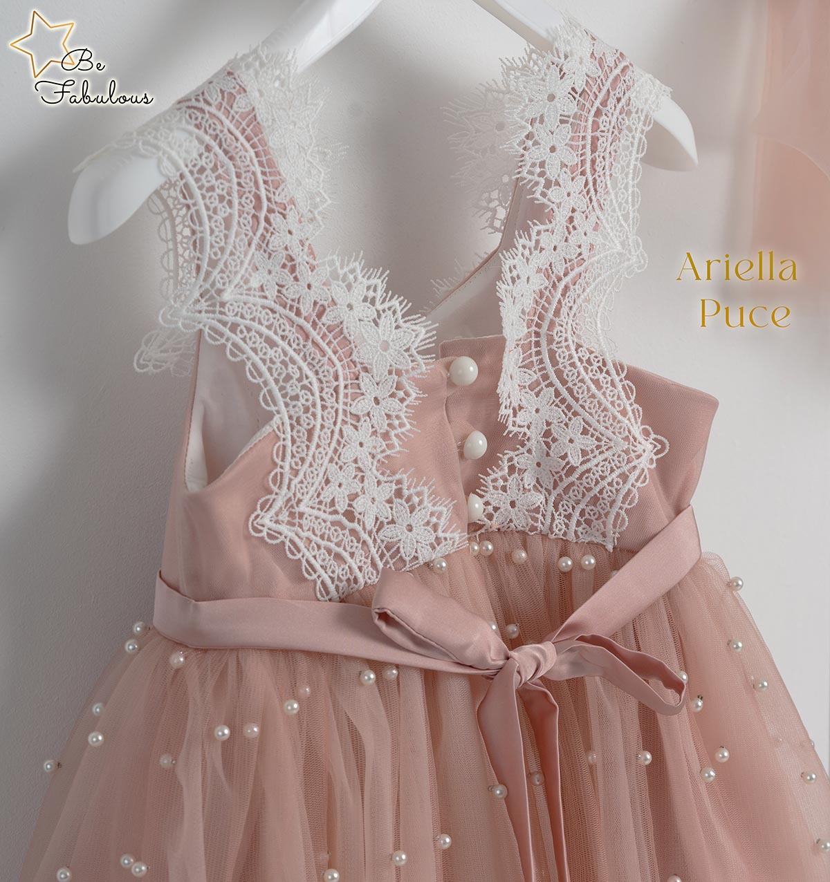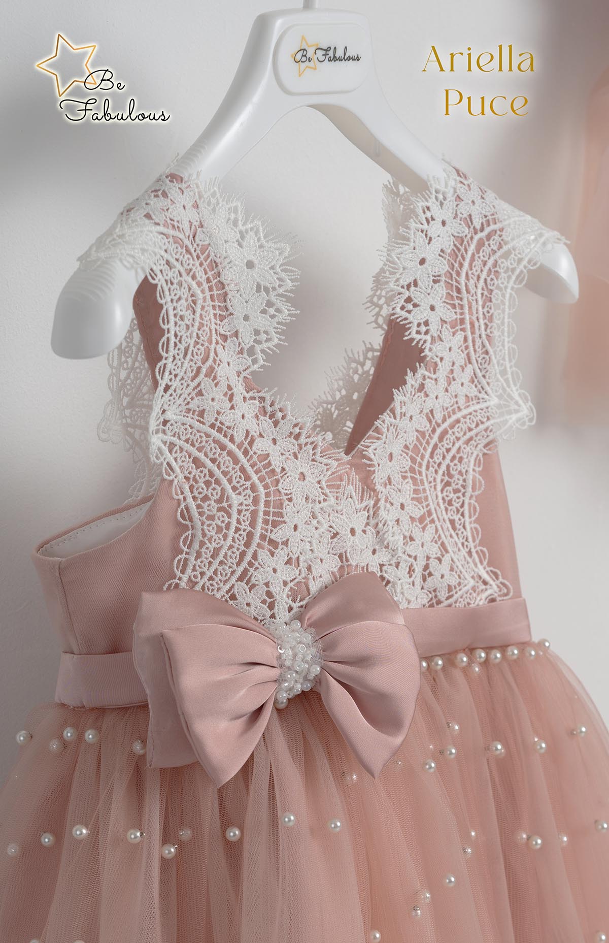 Βαπτιστικό φόρεμα Be Fabulous Ariella Puce. Φόρεμα με μπούστο από δαντέλα σε σχήμα V, σατέν ζωνάκι και τούλινη φούστα με πέρλες. Πλάτη σε σχήμα V με δαντέλα . Το ντεκόρ του φορέματος αποτελείται απο διπλό φιογκάκι από σατέν με αστραφτερό δέσιμο. Το φόρεμα συνοδέυεται απο μπαντάνα με ντεκόρ όμοιο με το φόρεμα. Διαθέσιμο σε 4 μεγέθη: 6-12, 12-18, 18-24, 24-36(εξτρά χρέωση)