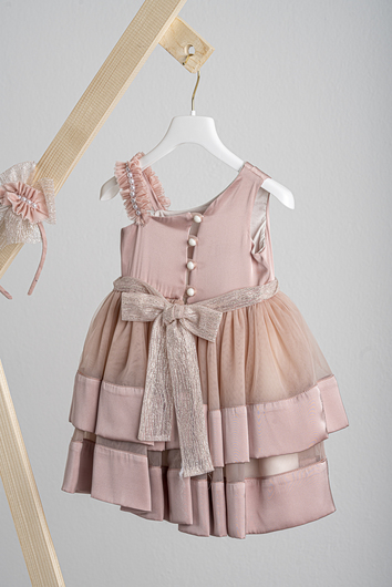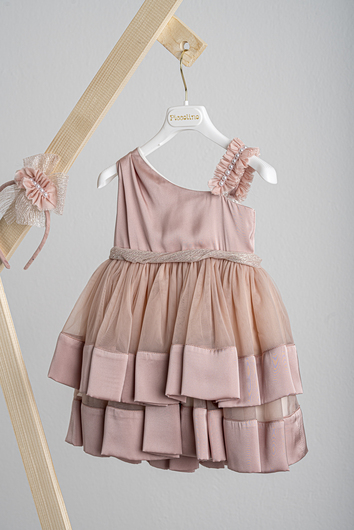 Bαπτισικό φόρεμα Piccolino Iris Puce. Εντυπωσιακό φόρεμα με μπούστο από σατέν και φούστα με βολάν δύο επιπέδων από τούλι και σατέν. Στο φόρεμα ξεχωρίζει το ιδιαίτερο κόψιμο του, δίνοντας την ψευδαίσθηση φορέματος με έναν ώμο έχοντας όμως παράλληλα ένα ιδιαίτερο ραντάκι με σούρες προσφέροντας την κατάλληλη στήριξη από την μία πλευρά και όμορφες διακριτικές πιέτες από την άλλη πλευρά . Το ντεκόρ του φορέματος αποτελείται από τούλινο ζωνάκι με γκλίτερ. Το φόρεμα συνοδέυεται απο στέκα με ντεκόρ όμοιο με το φόρεμα. Διαθέσιμο σε 4 μεγέθη: 6-12, 12-18, 18-24, 24-36(εξτρά χρέωση)