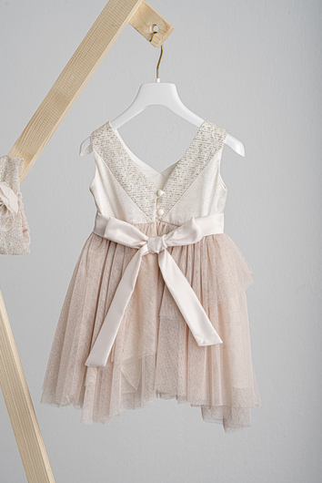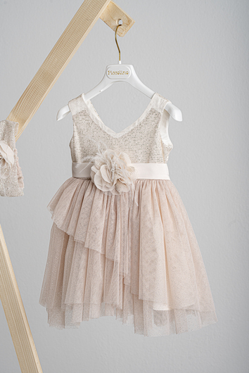 DR25S146.CHAMPAGNE Βαπτιστικό φόρεμα Piccolino Augusta Champagne. Μπούστο απο τούλι με γκλίτερ με λαιμόκοψη σε σχήμα V. Ασύμμετρη τούλινη φούστα με γκλίτερ. Σατέν ζωνάκι με δέσιμο στο πίσω μέρος. Το ντεκόρ του φορέματος αποτελείται απο χειροποίητο λουλούδι με πούπουλα μαραμπού. Το φόρεμα συνοδέυεται απο κορδέλα με ντεκόρ όμοιο με το φόρεμα. Διαθέσιμο σε 4 μεγέθη: 6-12, 12-18, 18-24, 24-36(εξτρά χρέωση)