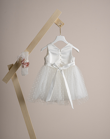 DR25S156.IVORY Βαπτιστικό φόρεμα Piccolino Constance Ivory, Φόρεμα μεσάτο με ένα ιδιαίτερα γοητευτικό μπούστο με πιέτες απο σατέν με Ζωνάκι απο σατέν που καταλήγει σε δέσιμο φιογκάκι πίσω στην πλάτη. Εντυπωσιακή ασσύμετρη τούλινη φούστα με ανάγλυφο πουά, με πιο μακρύ το πίσω μέρος της. Το ντεκόρ του φορέματος αποτελείται απο χειροποίητα λουλούδια και μαραμπού. Το φόρεμα συνοδέυεται απο κορδέλα με ντεκόρ όμοιο με το φόρεμα. Διαθέσιμο σε 4 μεγέθη: 6-12, 12-18, 18-24, 24-36(εξτρά χρέωση)