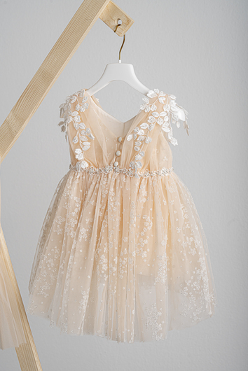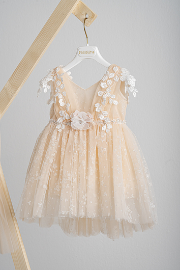 DR25S158.SALMON Βαπτιστικό φόρεμα Piccolino Filomena Salmon . Απόλυτα λαμπερό φόρεμα. Μπούστο απο τούλι με ιδιαίτερο σχέδιο από γκλίτερ με λαιμόκοψη σε σχήμα καρδιάς και σχέδιο από τούλι που ξεκινά από τους ώμους και καταλήγει στη μέση στολισμένο με μοτίφ με φύλλα και στρας που καταλήγουν και στο πίσω μέρος του φορέματος. Ασσύμετρη φούστα ελαφρώς μακρύα στο πίσω μέρος από ιδιαίτερο τούλι με γκλίτερ που τραβάει τα βλέμματα. Το ντεκόρ του φορέματος αποτελείται απο εντυπωσιακά χειροποίητα λουλούδια με στρας swarovski και αστραφτερό ζωνάκι. Το φόρεμα συνοδέυεται απο μπαντάνα με ντεκόρ όμοιο με το φόρεμα. Διαθέσιμο σε 4 μεγέθη: 6-12, 12-18, 18-24, 24-36(εξτρά χρέωση)