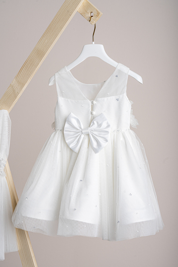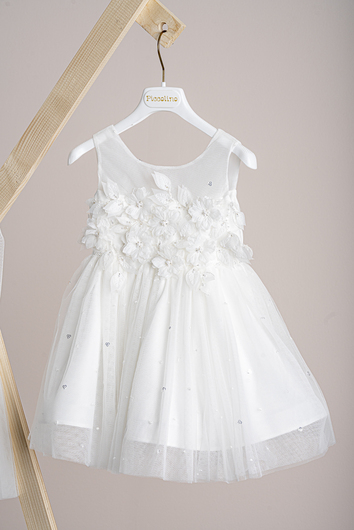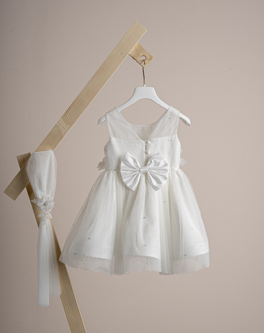DR25S148.IVORY Βαπτιστικό φόρεμα Piccolino Jessica Ivory, Φόρεμα μεσάτο με μπούστο δύο επιπέδων, στο ύψος των ώμων ελαφρυά διαφάνεια με τούλι με ελαφρυά παγιέτα, το υπόλοιπο μπούστο είναι διακοσμημένο με μοτίφ από χειροποίητα λουλούδια και ένα υπέροχο διακριτικό με στρας λεπτό ζωνάκι στη μέση. Στο πίσω μέρος καταλήγει σε ένα ελαφρύ V με φιόγκο απο σατέν για ντεκορ. Με άκρως εντυπωσιακή φούστα με τούλι με ελαφρυά παγιέτα. Το φόρεμα συνοδέυεται απο μπαντάνα με ντεκόρ όμοιο με το φόρεμα. Διαθέσιμο σε 4 μεγέθη: 6-12, 12-18, 18-24, 24-36(εξτρά χρέωση)