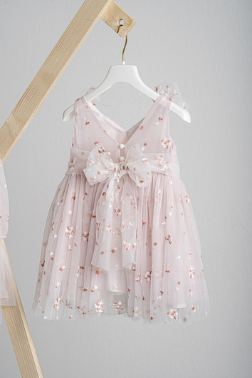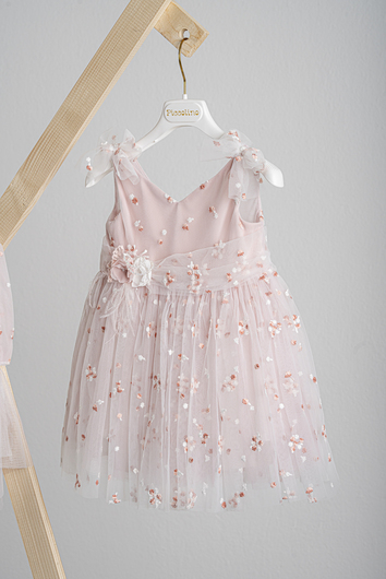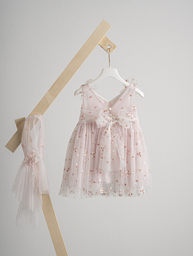 DR25S164.PUCE Βαπτιστικό φόρεμα Piccolino Klara Puce. Φόρεμα από ανάγλυφη με λουλουδάκια δαντέλα με λαιμόκοψη σε σχήμα καρδιάς και πλάτη σε σχήμα V. Δύο φιογκάκια από την δαντέλα του φορέματος διακοσμούν τους ώμους καθώς όπως και ζωνάκι από την δαντέλα με δέσιμο που καταλήγει σε φιογκάκι στο πίσω μέρος διακοσμεί την μέση. Το ντεκόρ του φορέματος αποτελείται απο χειροποίητα λουλούδια, περλίτσες και πούπουλα μαραμπού. Το φόρεμα συνοδέυεται απο μπαντάνα με ντεκόρ όμοιο με το φόρεμα. Διαθέσιμο σε 4 μεγέθη: 6-12, 12-18, 18-24, 24-36(εξτρά χρέωση)