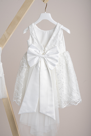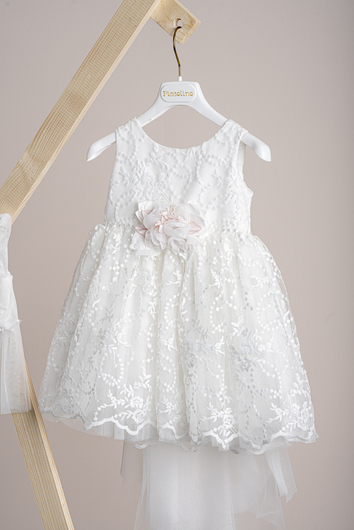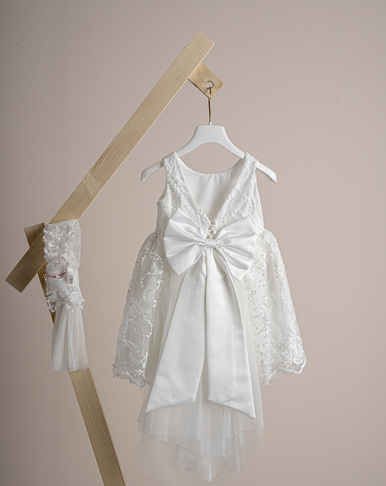 DR25S150.IVORY Βαπτιστικό φόρεμα Piccolino Michele Ivory, Φόρεμα απο δαντέλα με όμορφο τελείωμα στο κάτω μέρος, η εντυπωσιακή του πλάτη καταλήγει σε V και την διακοσμεί ένας σατέν φιόγκος κάτω από τον οποίο υπάρχει μία τούλινη ΄΄ουρά΄΄. Το ντεκόρ του φορέματος αποτελείται απο χειροποίητα λουλούδια. Το φόρεμα συνοδέυεται απο κορδέλα με ντεκόρ όμοιο με το φόρεμα. Διαθέσιμο σε 4 μεγέθη: 6-12, 12-18, 18-24, 24-36(εξτρά χρέωση)
