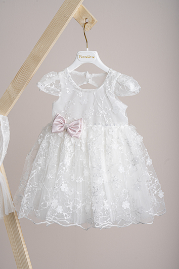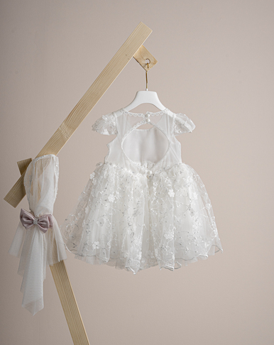 DR25S160.IVORY Βαπτιστικό φόρεμα Piccolino Patricia Ivory. Φόρεμα από ανάγλυφη δαντέλα με μανικάκι . Στο φόρεμα ξεχωρίζει η εντυπωσιακή ανοιχτή του πλάτη. Το ντεκόρ του φορέματος αποτελείται απο φιογκάκι και αστραφτερό αλλά ταυτόχρονα διακριτικό ζωνάκι. Το φόρεμα συνοδέυεται απο μπαντάνα με ντεκόρ όμοιο με το φόρεμα. Διαθέσιμο σε 4 μεγέθη: 6-12, 12-18, 18-24, 24-36(εξτρά χρέωση)
