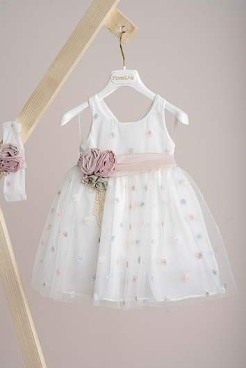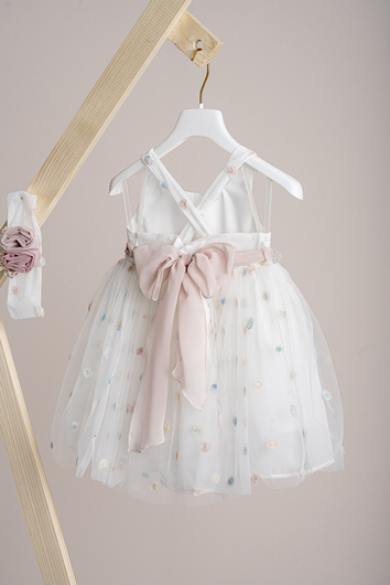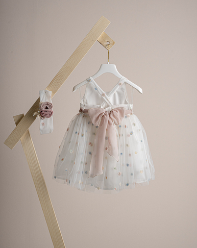 DR25S152.IVORY Βαπτιστικό φόρεμα Piccolino Rebecca Ivory. Φόρεμα απο εκρού τούλι με κεντημένα χρωματιστά λουλουδάκια. Πλάτη με δέσιμο χιαστί απο τις τιράντες και ανάλαφρο χρωματιστό ζωνάκι που καταλήγει σε έναν ανέμελο φιόγκο πίσω στην πλάτη. Το ντεκόρ του φορέματος αποτελείται απο χειροποίητα λουλούδια περλίτσες και boho κορδόνι. Το φόρεμα συνοδέυεται απο κορδέλα με ντεκόρ όμοιο με το φόρεμα. Διαθέσιμο σε 4 μεγέθη: 6-12, 12-18, 18-24, 24-36(εξτρά χρέωση)