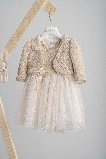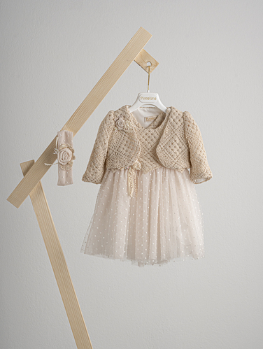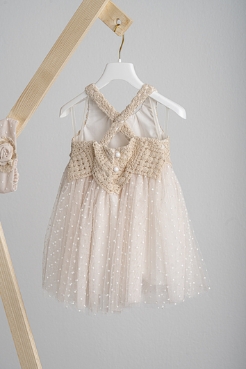 DR25S153.BEIGE Βαπτιστικό φόρεμα Piccolino Thea Beige. Φόρεμα απο εκρού πλεκτή δαντέλα στο μπούστο και εκρού πουά τουλινη φούστα. Πλάτη με δέσιμο χιαστί απο τις τιράντες. Το ντεκόρ του φορέματος αποτελείται απο χειροποίητο λουλούδι. Το φόρεμα συνοδέυεται απο κορδέλα με ντεκόρ όμοιο με το φόρεμα. Διαθέσιμο σε 4 μεγέθη: 6-12, 12-18, 18-24, 24-36(εξτρά χρέωση)