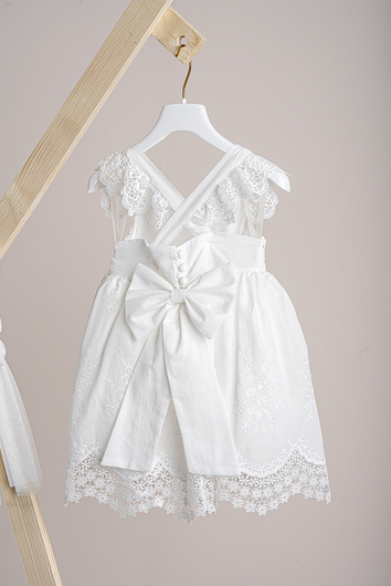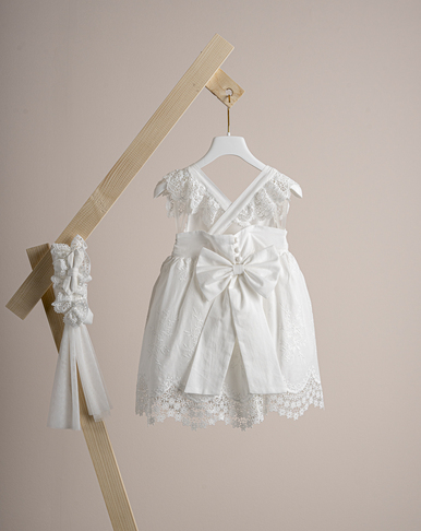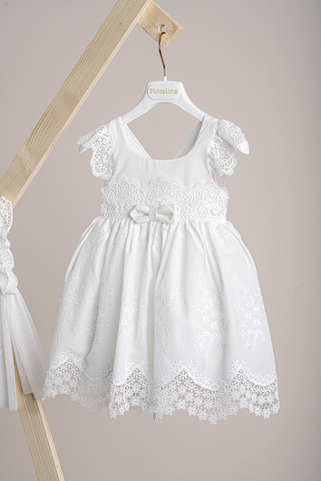 DR25S163.IVORY Βαπτιστικό φόρεμα Piccolino Valerie Ivory. Φόρεμα απο εκρού κηπουρ δαντέλα στο μπούστο και εκρού κηπούρ δαντέλα με όμορφο τελείωμα στη φούστα. Πλάτη με δέσιμο χιαστί απο τις τιράντες και δαντελένια μανικάκια.Την πίσω μεριά του φφορέματος διακοσμεί ένας ρομαντικός φιόγκος. Το ντεκόρ του φορέματος αποτελείται απο το δαντελένιο ζωνάκι και από το μικρό διακριτικό φιογκάκι. Το φόρεμα συνοδέυεται απο μπαντάνα με ντεκόρ όμοιο με το φόρεμα. Διαθέσιμο σε 4 μεγέθη: 6-12, 12-18, 18-24, 24-36(εξτρά χρέωση)