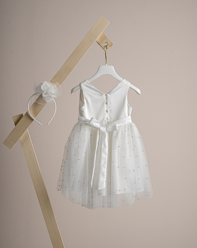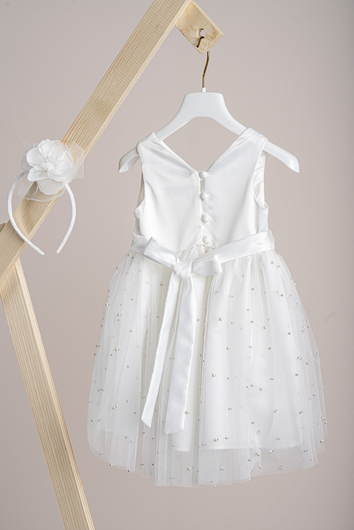 DR25S154.IVORY Βαπτιστικό φόρεμα Piccolino Zoe Ivory, Φόρεμα μεσάτο με ένα ιδιαίτερα γοητευτικό μπούστο με πιέτες απο σατέν με Ζωνάκι απο σατέν που καταλήγει σε δέσιμο φιογκάκι πίσω στην πλάτη. Εντυπωσιακή ασσύμετρη τούλινη φούστα με πέρλες, με πιο μακρύ το πίσω μέρος της. Το ντεκόρ του φορέματος αποτελείται απο χειροποίητο λουλούδι, στρας και μαραμπού. Το φόρεμα συνοδέυεται απο στέκα με ντεκόρ όμοιο με το φόρεμα. Διαθέσιμο σε 4 μεγέθη: 6-12, 12-18, 18-24, 24-36(εξτρά χρέωση)