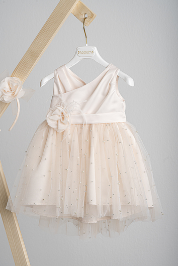 DR25S154.PEACH Βαπτιστικό φόρεμα Piccolino Zoe Peach, Φόρεμα μεσάτο με ένα ιδιαίτερα γοητευτικό μπούστο με πιέτες απο σατέν με Ζωνάκι απο σατέν που καταλήγει σε δέσιμο φιογκάκι πίσω στην πλάτη. Εντυπωσιακή ασσύμετρη τούλινη φούστα με πέρλες, με πιο μακρύ το πίσω μέρος της. Το ντεκόρ του φορέματος αποτελείται απο χειροποίητο λουλούδι, στρας και μαραμπού. Το φόρεμα συνοδέυεται απο στέκα με ντεκόρ όμοιο με το φόρεμα. Διαθέσιμο σε 4 μεγέθη: 6-12, 12-18, 18-24, 24-36(εξτρά χρέωση)