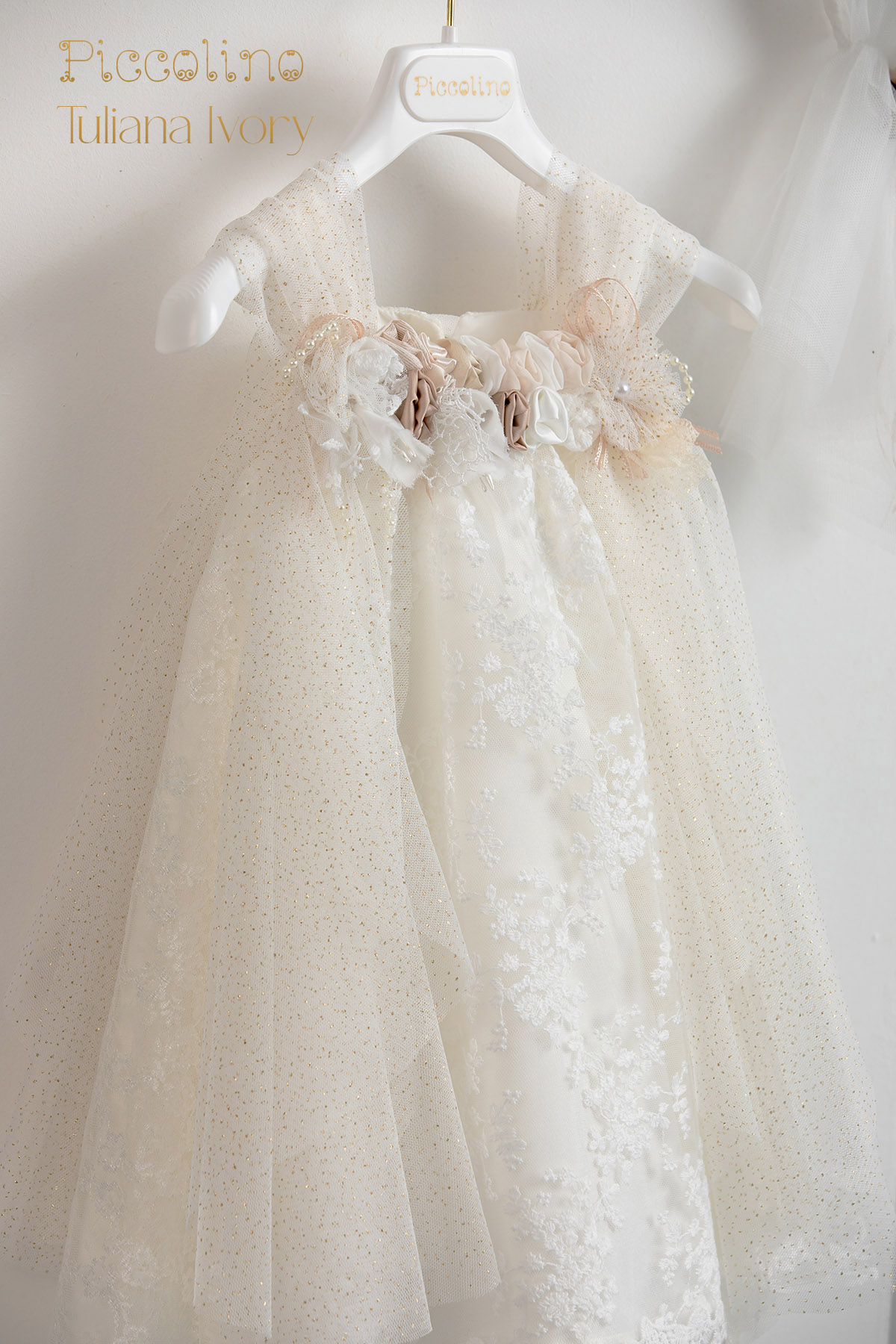 Βαπτιστικό φόρεμα Piccollino Tuliana Ivory. Φόρεμα σε ριχτη γραμμή απο δαντέλα, με κομάτια απο εκρού τούλι με χρυσό γκλίτερ τα οποία αποτελούν τις τιράντες και την προέκταση τους εμπρός και πίσω.Το ντεκόρ του φορέματος αποτελείται απο 22 χειροποίητα λουλούδια, δαντέλες και κορδέλες . Το φόρεμα συνοδέυεται απο μπαντάνα με ντεκόρ όμοιο με το φόρεμα. Διαθέσιμο σε 4 μεγέθη: 6-12, 12-18, 18-24, 24-36(εξτρά χρέωση)