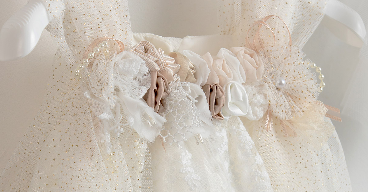 Σετ λαδόπανα Piccolino LK-TULIANA IVORY. Αποτελείται απο βαμβακερό λαδόπανο, πετσέτα 140*70εκ, εσώρουχα και πετσέτα ιερέα 30*50εκ. Στολισμένα με χειροποίητα υφασμάτινα λουλούδια. Συνοδευτικό του φορέματος Piccolino TULIANA IVORY