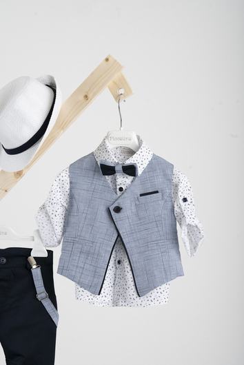 AG25S84.BLUE Βαπτιστικό κοστούμι Piccolino Didler σε χρώμα Blue. Περιλαμβάνει κλασάτο σταυρωτό γιλέκο μονόκουμπο με λοξάδα, πουκάμισο βαμβακερό, παντελόνι βαμβακερό σε χρώμα Blue, διπλο παπιγιόν, τιράντες και καπέλο με φάσα. Διαθέσιμο σε 4 μεγέθη 6-12, 12-18, 18-24, 24-36(εξτρά χρέωση)
