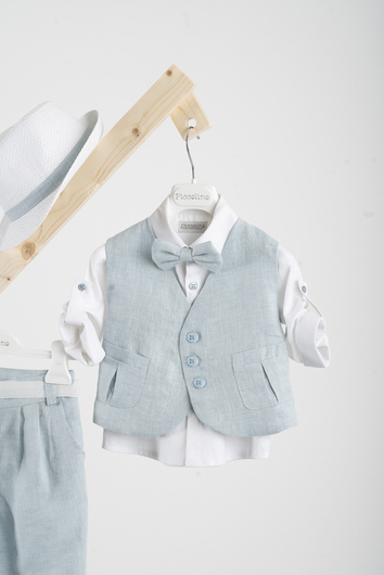 AG25S88.CIELE Βαπτιστικό κοστούμι Piccolino Emanuel σε χρώμα Ciele. Περιλαμβάνει λινό γιλέκο καμπυλόγραμμο, πουκάμισο λινό, παντελόνι λινό βράκα με πιέτες σε χρώμα ciele, υαφασμάτινο παπιγιόν, ζώνη με double D δέσιμο και καπέλο με φάσα. Διαθέσιμο σε 4 μεγέθη 6-12, 12-18, 18-24, 24-36(εξτρά χρέωση)